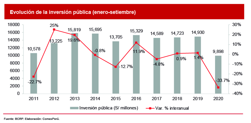 De acuerdo con las cifras del BCRP, al tercer trimestre de 2020, la inversión pública ascendió a S/ 9,898 millones, 33.7% menos con respecto al mismo periodo del año anterior, en el que se invirtieron S/ 14,930 millones (+1.4% con respecto a 2018). En cuanto a los proyectos de inversión pública, al tercer trimestre de 2020, el Gobierno central ejecutó S/ 5,517 millones, un 30.8% menos en comparación con el mismo periodo de 2019. Por su parte, los Gobiernos regionales, ejecutaron S/ 2,888 millones, 19% menos con respecto al mismo periodo de 2019. El sector en el que más se invirtió fue transportes, con S/ 657 millones, seguido de salud, con S/ 609 millones, y educación, con S/ 504 millones. Por último, los Gobiernos locales ejecutaron S/ 4,676 millones, lo que significó una disminución del 39.6% con relación al mismo periodo de 2019. El sector en el que más se invirtió fue transporte, con S/ 1,355 millones, seguido por saneamiento, con S/ 864 millones, y educación, con S/ 569 millones.