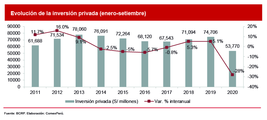 En cuanto a la inversión privada, al tercer trimestre de 2020, esta ascendió a S/ 53,770 millones, lo que significó una contracción del 28% con respecto al mismo periodo de 2019, durante el cual se invirtieron S/ 74,706 millones. Del mismo modo, la inversión privada como porcentaje del PBI alcanzó un 15.6%, 2.9 puntos porcentuales menos que lo registrado el año pasado, y significaría la cifra más baja del trimestre desde 2007. Además, de acuerdo con cifras del BCRP, para el tercer trimestre de 2020, el flujo de Inversión Extranjera Directa (IED) se habría contraído un 72.4%, al alcanzar los US$ 1,595 millones, respecto del mismo periodo de 2019, cuando ascendió a US$ 5,785 millones.
