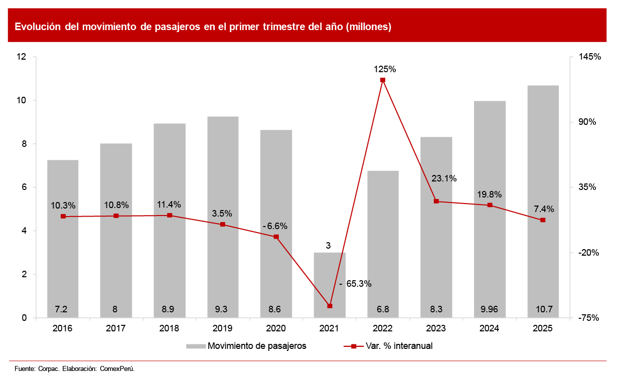 Entre enero y marzo de 2025, 10.7 millones de pasajeros se movilizaron por los aeropuertos del Perú, un 7.4% más en comparación con el mismo periodo de 2024 y un 15.5% más respecto de 2019, según cifras de la Corporación Peruana de Aeropuertos y Aviación Comercial (Corpac). Esto superó nuevamente el nivel registrado en 2019, previo al impacto de la pandemia.