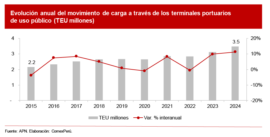 En aquel entonces, el país contaba con 24 terminales portuarios (20 marítimos y 4 fluviales) que movilizaban aproximadamente 700,000 contenedores y 48.8 millones de toneladas métricas de carga. Actualmente, la infraestructura portuaria ha crecido significativamente hasta alcanzar 63 terminales (48 marítimos, 14 fluviales y 1 embarcadero), de los cuales 8 han sido concesionados bajo el modelo de asociación público-privada (APP). Este desarrollo ha sido determinante para dinamizar el sector, lo que se refleja en el incremento del movimiento de carga. En 2024, el Sistema Portuario Nacional movilizó más de 127.8 millones de toneladas, lo que representó un crecimiento del 8.4% con respecto al año anterior, según cifras de la APN.