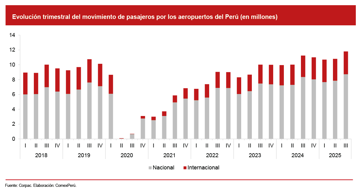 Un total de 33.3 millones de pasajeros se movilizaron por los aeropuertos del país entre enero y setiembre de 2025, un 6.7% más que en similar periodo de 2024 y un 12.1% por encima del nivel prepandemia. Si bien la actividad aérea continúa creciendo, persisten desafíos en la infraestructura aeroportuaria existente.