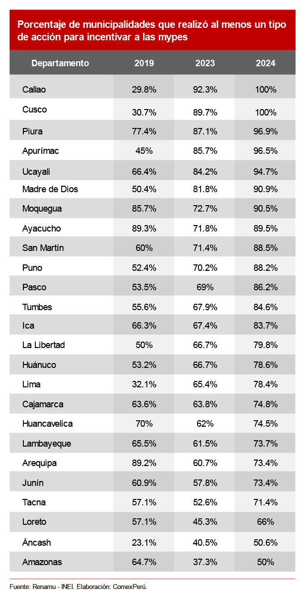 A nivel departamental, la provincia constitucional del Callao y Cusco lideraron el ranking municipal de acciones para incentivar a las mypes dentro de su jurisdicción, pues el 100% de sus municipios implementaron al menos una acción para motivar a las mypes en 2024. Este resultado no solo implica una mejora respecto del año previo, sino también un salto importante respecto de 2019. Continúan la lista los departamentos de Piura, Apurímac y Ucayali, con el 96.9%, 96.5% y 94.7% de sus municipalidades que implementaron alguna acción de incentivo a las mypes, respectivamente.