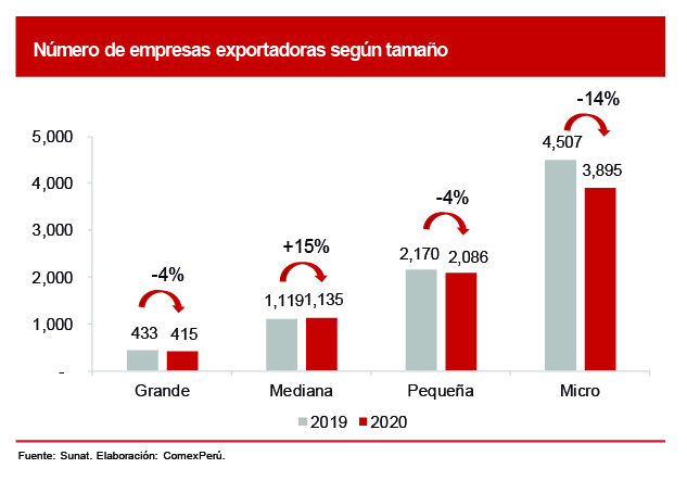 Durante la última década, cada vez más empresas peruanas han tomado el rumbo de la internacionalización, aunque este crecimiento ha sido lento y quedó truncado por la llegada del coronavirus. Para tener una idea, el número total de empresas pasó de 8,229 en 2019 a 7,531 en 2020, lo que significó una caída interanual del 8.5%. Ahora bien, si analizamos por tamaño de empresa[1], encontramos que las microempresas concentraron el 51.7% del total de compañías exportadoras, mientras que las pequeñas, el 27.7%, y las medianas y grandes, un 20.6%. No obstante, el impacto de la contracción de los flujos comerciales afectó mayormente a las pequeñas y microempresas, que se redujeron un 14% y un 4%, respectivamente.