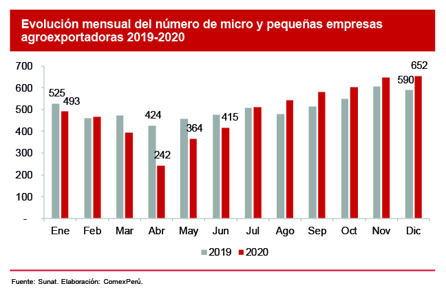En 2020, a pesar del deterioro del comercio internacional, nuestras exportaciones agropecuarias sostuvieron las tendencias de crecimiento registradas durante los años previos. Así, con un valor transado de US$ 6,795 millones, las exportaciones del sector agrícola no tradicional incrementaron un 7.5% (ver Semanario 1062). Este alentador desempeño también se reflejó en el número de empresas agroexportadoras que ofertaron sus productos en el mercado internacional.