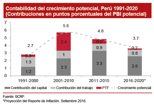 En el Reporte de Inflación de setiembre 2018, el Banco Central de Reserva del Perú (BCRP) señala que el crecimiento promedio del PBI potencial ha disminuido de un 5.6% en la década pasada, a 3.7% para el periodo 2016-2020. Esto debido a que, en buena parte, la rigidez laboral ha perjudicado el crecimiento de la productividad total de los factores (PTF), uno de los factores del crecimiento del PBI potencial. La contribución de la PTF al PBI potencial ha disminuido de 2.4 puntos porcentuales (pp), para el periodo 2000-2010, a 0.2 pp en su proyección 2016-2020. Asimismo, el BCRP recomienda que se fomente el empleo formal mediante una mayor flexibilidad laboral; mientras que el Ministerio de Economía y Finanzas (MEF), en reiteradas ediciones del Marco Macroeconómico Multianual, ha señalado que la legislación laboral peruana debe ser más flexible.