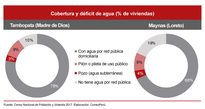 En Maynas, por ejemplo, si bien el 68.2% de viviendas recibe agua por red pública domiciliaria, aún existe un 18.4% de viviendas que no cuenta con este servicio y un 9.2% que se abastece de un pozo o pileta de uso público. Además, cabe resaltar que, de las viviendas que cuentan con este servicio en la provincia, un 11.6% no lo tiene todos los días de la semana. De igual forma, en Tambopata, el 77.6% de viviendas tiene agua por red pública, pero un 10% no cuenta con agua vía esta red y un 9.5% utiliza un pozo. Así, muchas familias, en su afán por juntar agua para su consumo diario, lamentablemente, generan las condiciones óptimas para la creación de criaderos del vector de transmisión.