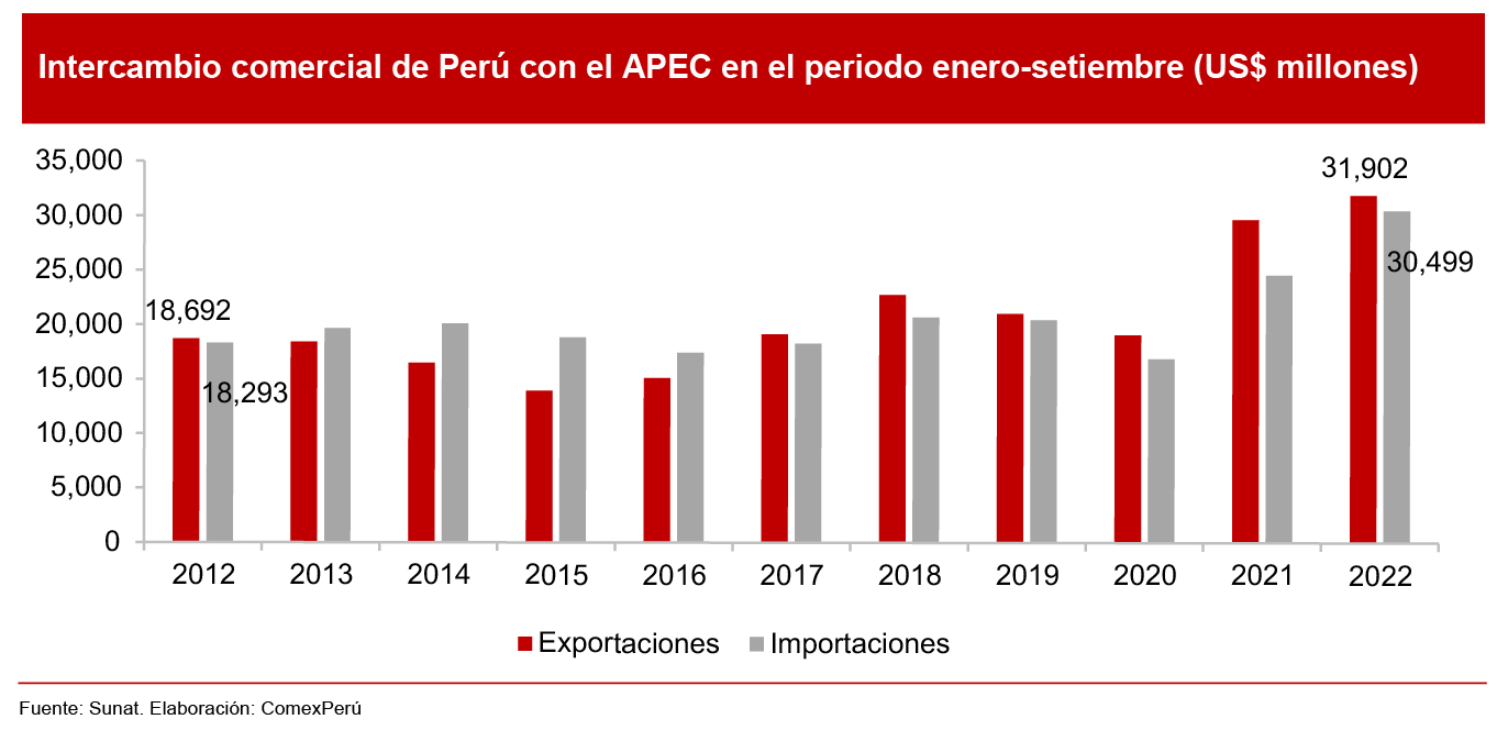Como mencionamos en el Semanario anterior, el Foro de Cooperación Económica Asia-Pacífico (APEC, por sus siglas en inglés) representa una parte fundamental de nuestro comercio exterior desde nuestro ingreso, en 1998. Como consecuencia, recientemente, nuestro intercambio con el APEC ha alcanzado niveles sobresalientes. Así, de acuerdo con las cifras de la Sunat, en el periodo enero-setiembre de 2022 nuestras exportaciones tuvieron un valor de US$ 31,902 millones, un 7.5% más con relación al mismo periodo del año pasado, mientras que las importaciones tuvieron un valor de US$ 30,499 millones, un 24.2% por encima de 2021. Respecto del periodo prepandemia, las exportaciones fueron un 51.5% mayores y las importaciones, un 49.1%. Si vamos más atrás, hace 10 años, nuestros envíos y compras hacia y desde el APEC han crecido un 171% y un 167%, respectivamente.