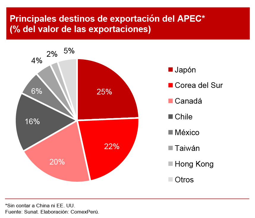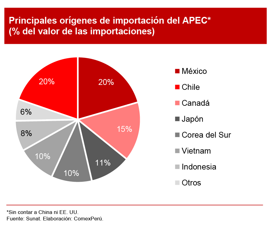 En relación con nuestros principales socios comerciales dentro del APEC, no es novedad que EE. UU. y China comanden los dos primeros lugares en exportaciones e importaciones. Por ello, en esta oportunidad resaltaremos al resto de los países. Considerando el periodo de análisis, son cuatro los países que se dividen gran parte de nuestras exportaciones: Japón, Corea del Sur, Canadá y Chile (el 87% del total). Detrás están México, Taiwán y Hong Kong, y ya con una menor participación tenemos a 10 países que suman un 5%. En contraste, las importaciones se han distribuido de una forma más equitativa; sin embargo, México se destaca por ser el principal país de origen, con una participación del 20%. En pocas palabras, fuera de los socios usuales, el Perú suele concentrar sus envíos a pocos países del APEC, mientras que sus compras provienen de múltiples países, muchas de los cuales no son menores.