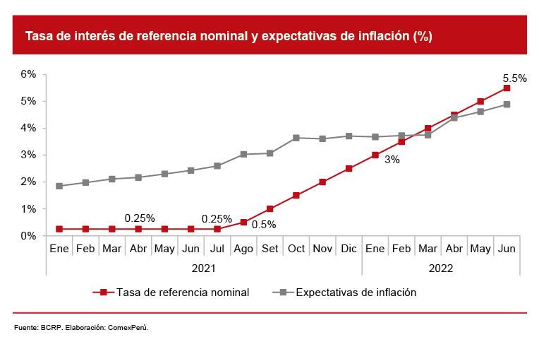 Con el avance en el proceso de vacunación contra la COVID-19 a nivel mundial y el control parcial de esta, los bancos centrales empezaron a retirar el estímulo monetario e incrementaron las tasas de interés. Así, en nuestro país, en 2021, dicha tasa pasó del 0.25% en julio al 0.5% en agosto. Desde entonces, progresivamente, cada mes la autoridad monetaria ha elevado la tasa en 50 puntos básicos hasta posicionarse en 5.5% en junio de este año.