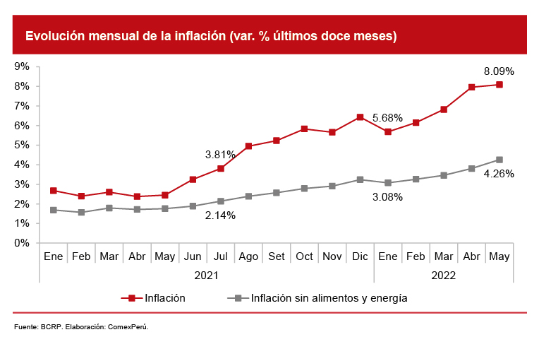 Por un lado, esta medida, junto a otros instrumentos de política monetaria, son aplicados por los bancos centrales para controlar la inflación en el corto plazo. Así, vemos que la tasa de inflación a doce meses se ubicó en un 8.09% en mayo, nivel por encima del rango meta, lo que se debe principalmente al alza significativa de los precios internacionales de insumos alimenticios y combustibles. Al analizar la inflación sin alimentos y energía a doce meses, esta también se elevó, al pasar del 3.81% en abril al 4.26% en mayo, también por encima del rango meta inflacionario.