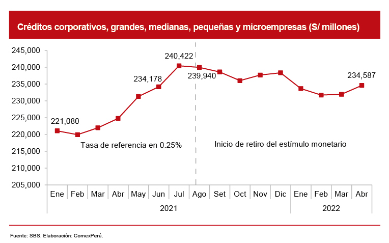 La subida de la tasa de interés de referencia encarece el costo del crédito en el corto plazo. Según Credicorp Capital, con los aumentos de la tasa de interés ya se estaría comprometiendo el crecimiento de la economía peruana. Además, el incremento de la tasa de referencia tendría efectos sobre el nivel de endeudamiento que asumen las personas naturales y las empresas, pues la deuda se encarece y, por tanto, hay un desincentivo para la adquisición de préstamos. Así, de acuerdo con cifras de la Superintendencia de Banca, Seguros y AFP (SBS), los créditos corporativos a grandes, medianas, pequeñas y microempresas muestran una evolución creciente hasta julio de 2021, pero esta tendencia creciente se detiene a partir de agosto del mismo año, lo que coincide con el inicio progresivo del retiro del estímulo monetario en el Perú, debido que en dicha fecha el BCRP subió la tasa de referencias por primera vez al 0.5% desde el inicio de la pandemia.