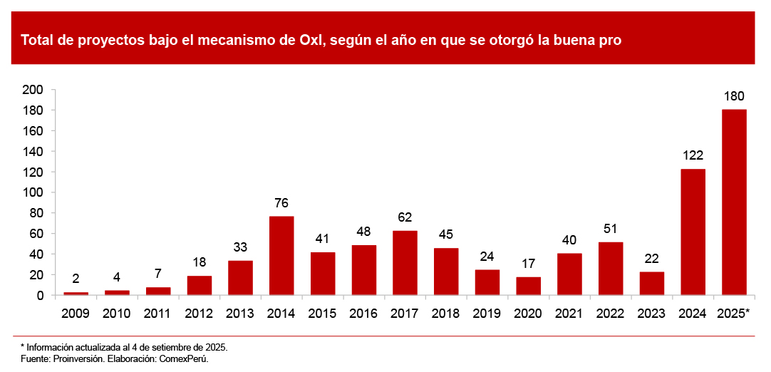 De acuerdo con información de ProInversión, desde 2009 se han adjudicado 792 proyectos a nivel nacional, bajo los tres niveles de gobierno. Esto considera a todos los proyectos en cualquiera de las diferentes fases: convenio suscrito, adjudicado, en ejecución y concluido. En la década pasada, el mecanismo alcanzó un pico de 76 proyectos con buena pro en 2014, y en los últimos años, al cierre de 2024, se alcanzó un total de 122 proyectos a los que se les otorgó la buena pro, y en lo que va de 2025[1] ya son 180 proyectos.