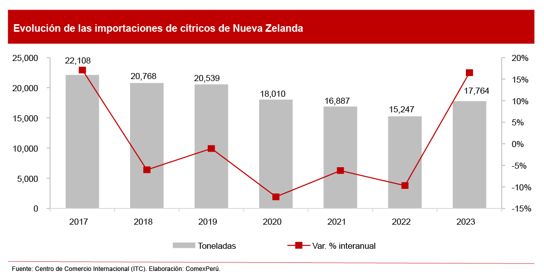 De acuerdo con cifras del Centro de Comercio Internacional (ITC, por sus siglas en inglés), Nueva Zelanda importó del mundo 17,764 toneladas de cítricos en 2023, lo que reflejó un crecimiento del 16.5% con respecto a 2022. Entre los principales productos destacaron las naranjas y mandarinas frescas, que representaron el 47% y el 40%, respectivamente, del total importado. Con respecto a los principales proveedores, en 2023, figuraron Australia (9,158 toneladas) y EE. UU. (7,429 toneladas), que concentraron el 93.4% del total importado por dicho mercado.