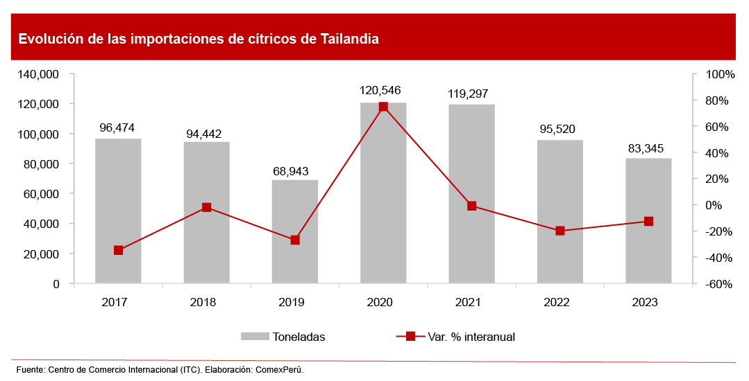 Por su parte, el país asiático realizó compras internacionales de cítricos por un total de 83,345 toneladas en 2023, aunque esto reflejó un descenso del 12.7% interanual, de acuerdo con el ITC. Las mandarinas figuraron como el principal producto importado por el mercado tailandés, al representar el 85.6% del total. China y Australia destacaron como los principales proveedores, con envíos de 60,616 toneladas y 19,897 toneladas, respectivamente.