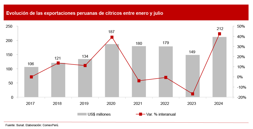 Las exportaciones de cítricos sumaron US$ 212 millones entre enero y julio de 2024, lo que reflejó un incremento del 42.5% con respecto al mismo periodo en 2023, de acuerdo con cifras de la Sunat. Dicho valor exportado también superó la cifra récord de enero y julio de 2020 (US$ 187 millones).