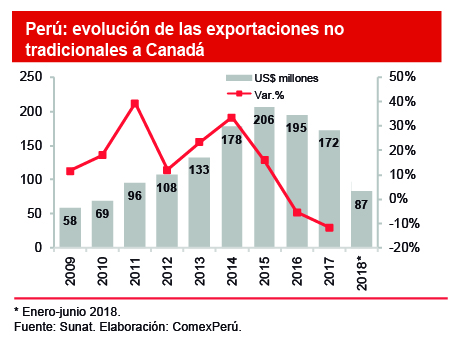 Por el contrario, las exportaciones no tradicionales exhibieron un gran dinamismo. Entre 2009 y 2017, nuestros envíos no tradicionales a Canadá pasaron de US$ 58 millones a unos US$ 172 millones, lo que evidenció un crecimiento acumulado del 195.2%. Esto equivale a una tasa de crecimiento promedio anual del 14.5%. Cabe destacar que el rubro no tradicional ha ganado terreno dentro de la composición de las exportaciones del Perú hacia Canadá. De esta forma, si bien antes de la entrada de vigencia del TLC estas representaban apenas un 3% de los envíos totales hacia dicho mercado, en 2017 equivalieron a un 14% del total exportado. Asimismo, entre enero y junio de este año, crecieron un 14.9% respecto del mismo periodo de 2017.