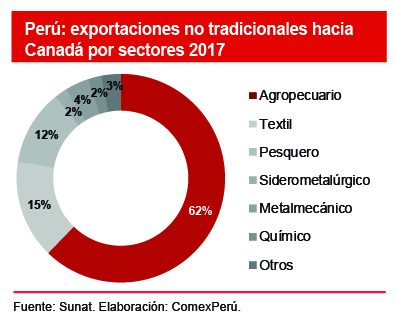 En este resultado, el sector agroexportador jugó un rol importante. En 2017, representó más de la mitad de las exportaciones no tradicionales a Canadá, las que, entre el período 2009-2017, registraron una tasa de crecimiento promedio anual del 17.3%. Lo siguió el sector textil y confecciones, y el sector pesquero, cuyas exportaciones crecieron a una tasa promedio del 5.5% y el 24.4%, respectivamente. Así, entre los diez principales productos no tradicionales enviados a Canadá encontramos a las uvas frescas, la quinua, el mango, el cacao en grano, los t-shirt de algodón y los demás filetes congelados de trucha.