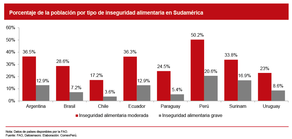 En el Perú, según el informe, existen 16.6 millones de personas sufriendo de este problema, es decir, esto afecta a más del 50% de la población. Además, contamos con 6.8 millones de peruanos en situación de inseguridad alimentaria grave, lo cual significa que una persona estuvo todo un día sin comer en repetidas oportunidades en un año. En comparación con los países de la región, el Perú ha obtenido los peores porcentajes respecto de su población.