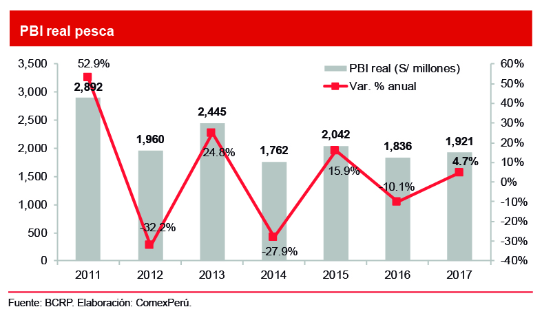 Durante los últimos años, la industria pesquera sufrió debido a las condiciones oceanográficas que no permitieron su desarrollo de manera sostenida; sin embargo, en 2017, el sector registró un crecimiento del 9.5%, con lo que logró revertir la caída de 2016. Además, en el primer trimestre de este año, la producción pesquera registró un incremento del 6.1% con respecto al mismo periodo del año anterior, y se posicionó como el sector con mayor crecimiento en este periodo.