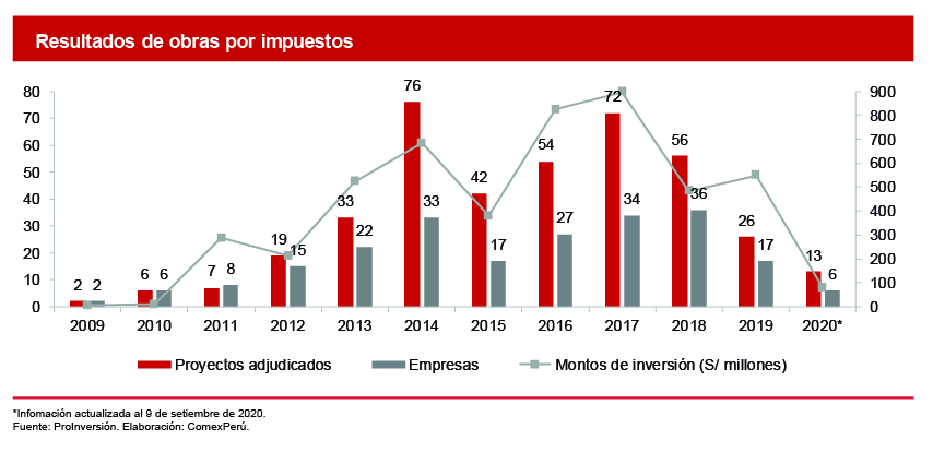 Sin embargo, las OxI se están utilizando cada vez menos. Si bien en 2019 hubo una recuperación en cuanto al monto de inversión comprometida[1], los datos de ProInversión muestran que la cantidad de proyectos adjudicados y el número de empresas que participan de este mecanismo están a la baja. Mientras que en 2018 participaron 36 empresas y se adjudicaron 56 proyectos, en 2019 fueron 17 empresas y 26 proyectos registrados. En cuanto a este año, solo se han adjudicado 13 proyectos (seis durante el estado de emergencia) por un monto de S/ 78 millones, a través de seis empresas.