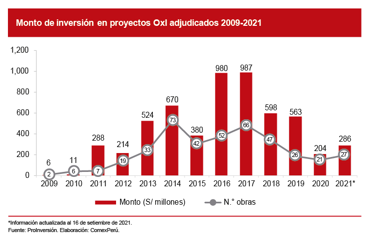Según cifras de la Agencia de Promoción de la Inversión Privada (ProInversión), desde su implementación en 2009 hasta la fecha[1], se han adjudicado 421 proyectos bajo esta modalidad, con un monto total comprometido de S/ 5,710 millones. A nivel sectorial, del total de las obras adjudicadas, el 30% son de transporte; el 29%, de educación; el 13%, de saneamiento; el 11%, de salud, y 17% restante, de sectores como seguridad, agropecuario, entre otros.