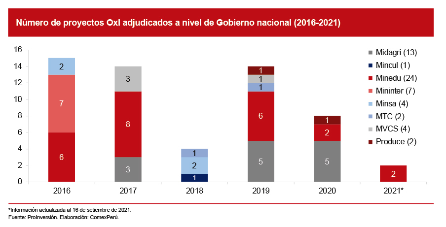 Un aspecto para resaltar es el desempeño del Gobierno nacional en la ejecución de obras a través del mecanismo OxI. Entre 2016 y 2020, distintos ministerios han adjudicado un total de 55 obras por un valor de S/ 1,489 millones. No obstante, la tendencia del número de proyectos con esta modalidad va a la baja. A la fecha, solo dos proyectos del sector educación, que suman un total de S/ 22 millones, cuentan con la buena pro para ser ejecutados.