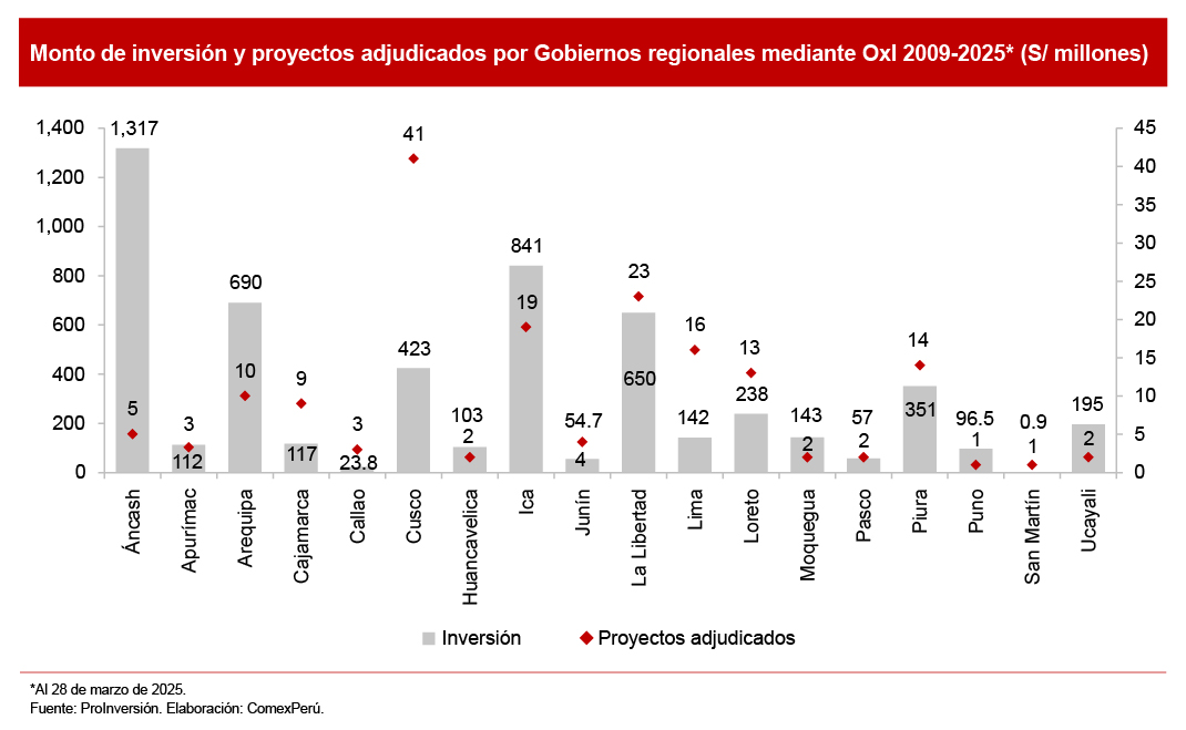 El Gobierno Regional de Áncash lidera ampliamente el ranking, según monto de inversión, con un total adjudicado de S/ 1,317 millones, seguido por Ica (S/ 841 millones) y Arequipa (S/ 690 millones). Estos Gobiernos regionales conforman buena parte de la inversión movilizada a través de OxI, lo que muestra una mayor articulación con el sector privado. Por otro lado, los Gobiernos regionales de Junín, Callao y San Martín son los que menor monto de inversión presentan (S/ 54.7 millones, S/ 23.7 millones y S/ 939,648, respectivamente).