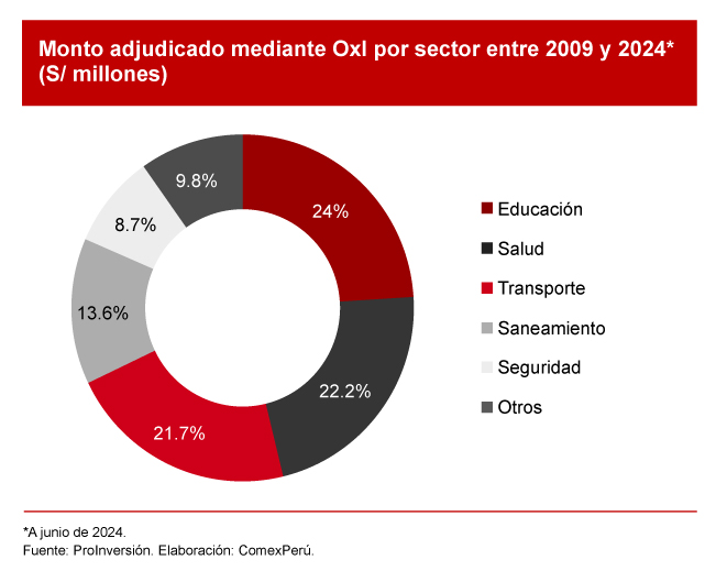El sector educación es el que posee mayor inversión acumulada mediante OxI, con un monto de S/ 2,206 millones, una participación de 24% del total de inversión y 150 proyectos adjudicados. Le siguen salud (S/ 2,035 millones, 22.2%, 20 proyectos) y transporte (S/ 1,989 millones, 21.7%, 135 proyectos), según datos de ProInversión.