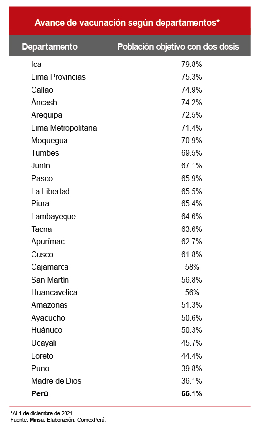 En ese sentido, según el Repositorio Único Nacional de Información en Salud, del Ministerio de Salud, cuatro departamentos presentan menos del 50% de su población objetivo con el esquema de vacunación completo al 1 de diciembre, lo cual resulta preocupante. En detalle, Madre de Dios (36.1% de su población objetivo completamente vacunada), Puno (39.8%), Loreto (44.4%) y Ucayali (45.7%) presentarían una mayor vulnerabilidad frente a una tercera ola.