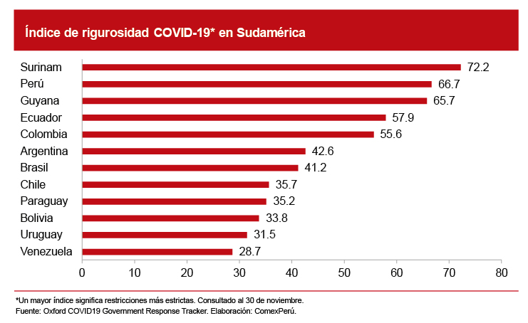 De hecho, el Perú se posiciona como el segundo país sudamericano que enfrenta las mayores restricciones según el Índice de rigurosidad de Oxford COVID-19 Government Response Tracker, de la Universidad de Oxford. Este índice es una medida compuesta basada en nueve indicadores de respuesta que incluyen el cierre de escuelas, el cierre de lugares de trabajo, la prohibición de viajar, etc.