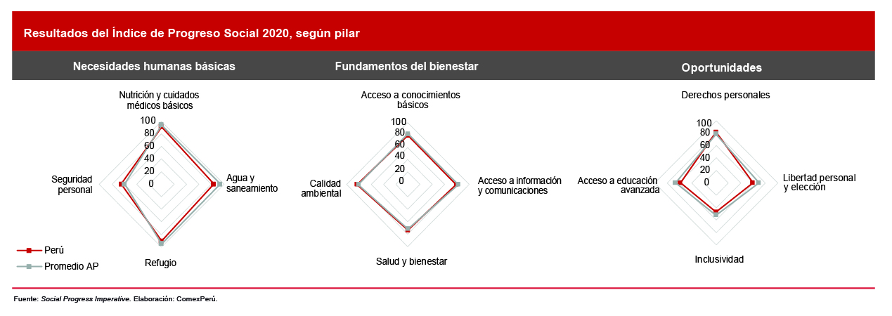 Los resultados del IPS 2020 muestran que el Perú ocupa la posición 59 entre 149 países, con un puntaje de 74.2, y se encuentra en la categoría de Progreso Social Medio Alto, junto con países como Chile (puesto 34), Uruguay (38), Argentina (41), Brasil (61), México (62) y Colombia (60). En términos del ranking, según pilares, el Perú alcanzó el puesto 85 en Necesidades Básicas Humanas, con 82.5 puntos; el puesto 52 en Fundamentos del Bienestar, con 78.5 puntos, y el puesto 63 en Oportunidades, con 61.7 puntos. Desde 2014, nuestro país ha mejorado su puntaje en los pilares Necesidades humanas básicas y Fundamentos del bienestar, con un 5% en cada uno, mientras que en el pilar Oportunidades ha retrocedido, principalmente por resultados deficientes relativos a los componentes Libertad personal y elección (el cual incluye corrupción y empleo), e Inclusividad (que incluye discriminación de minorías y equidad de poder político).