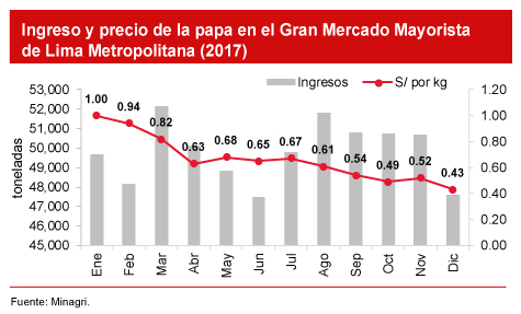 El alza en el precio habría inducido una mayor producción continua de papa, presionando posteriormente el precio a la baja, debido a la sobreproducción, por ejemplo durante 2010 y 2014, así como en 2017, en los puntos de abastecimiento, principalmente en el Gran Mercado Mayorista de Lima Metropolitana (GMML), que presenta el mayor movimiento comercial de productos agrícolas. De esta manera, entre 2007 y 2016, la producción creció a una tasa promedio anual del 3.3%; mientras que, hacia el tercer trimestre de 2017, fue un 6.1% mayor a la registrada en 2016. Ese año se comercializaron unas 540,577 toneladas de distintas variedades de papa en el GMML, de las cuales el 81% correspondió a la variedad de papa blanca; mientras que en 2017 fueron unas 598,016 toneladas solo de esta última variedad.