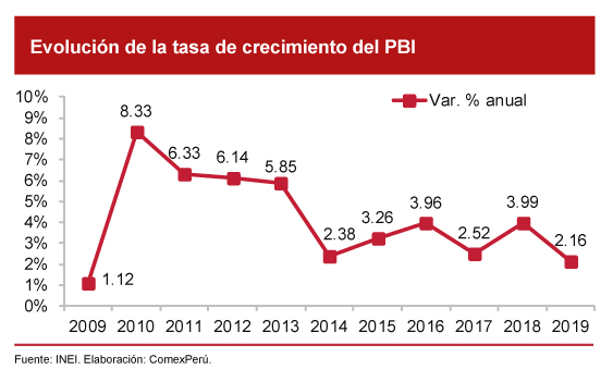 En 2019, según cifras del Instituto Nacional de Estadística e Informática (INEI), la economía peruana creció un 2.16% con respecto al año anterior, la tasa más baja desde 2009 (1.12%), cuando la producción nacional sufrió los efectos de la crisis financiera internacional. Este resultado se encuentra muy lejano al potencial del 4%[1] definido a inicios de 2019 por el Banco Central de Reserva del Perú (BCRP), y que se vio recortado progresivamente por una suma de acontecimientos, entre los principales, la inestabilidad política y la falta de ejecución de obras públicas.