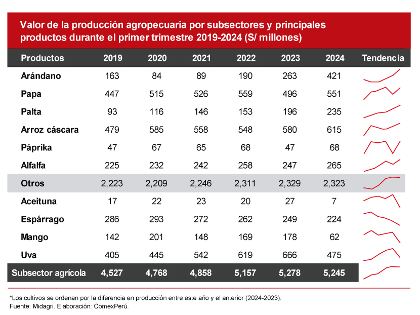 El producto que tuvo un mejor desempeño absoluto durante el primer trimestre fue el arándano, con S/ 158 millones más que lo reportado en el mismo periodo del año anterior. Esto se explica por la mayor producción en departamentos como La Libertad, Ica y Áncash. Otro producto que tuvo un alza importante fue la papa; con S/ 54 millones más, debido a las mejores condiciones climáticas en relación con la campaña agrícola anterior. A estos le siguieron la palta (+S/ 39 millones) y el arroz (+S/ 34 millones), por motivos similares, según el Midagri.