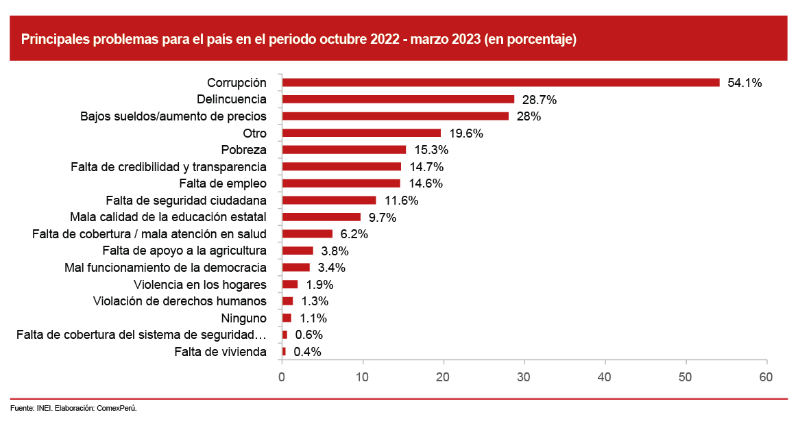 De acuerdo con el INEI, el 54.1% de las personas perciben a la corrupción como el principal problema del país para el periodo de análisis octubre 2022-marzo 2023, lo que evidencia un incremento de 2.4 puntos porcentuales (pp) con respecto al periodo octubre 2021-marzo 2022. Así, dicha problemática se posiciona por encima de otras preocupaciones como la delincuencia (28.7%; -3.4 pp), los bajos sueldos por un aumento de precios (28%; +3.8 pp) y la pobreza (15.3%; -3.6 pp).