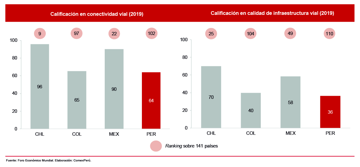 Por lo expuesto, la reanudación de las inversiones es un buen primer paso para la mejora de la competitividad y la reducción de brechas. Esto es especialmente importante si se tiene en cuenta que el país posee el peor comportamiento de la Alianza del Pacífico en infraestructura de transporte y se ubica en el puesto 97 de 141 economías, según el Reporte Global de Competitividad 2019. Asimismo, en lo que respecta a conectividad vial y calidad de infraestructura vial, también nos encontramos bastante rezagados, ya que ocupamos los puestos 102 y 110, respectivamente.