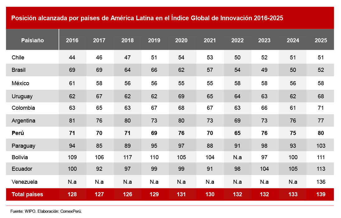 [1] En la edición 2025 del GII se incorporaron seis nuevas economías. De ellas, solo una se ubica por delante del Perú, por lo que la caída de cinco posiciones en el ranking no se explica necesariamente por la inclusión de estas nuevas economías.