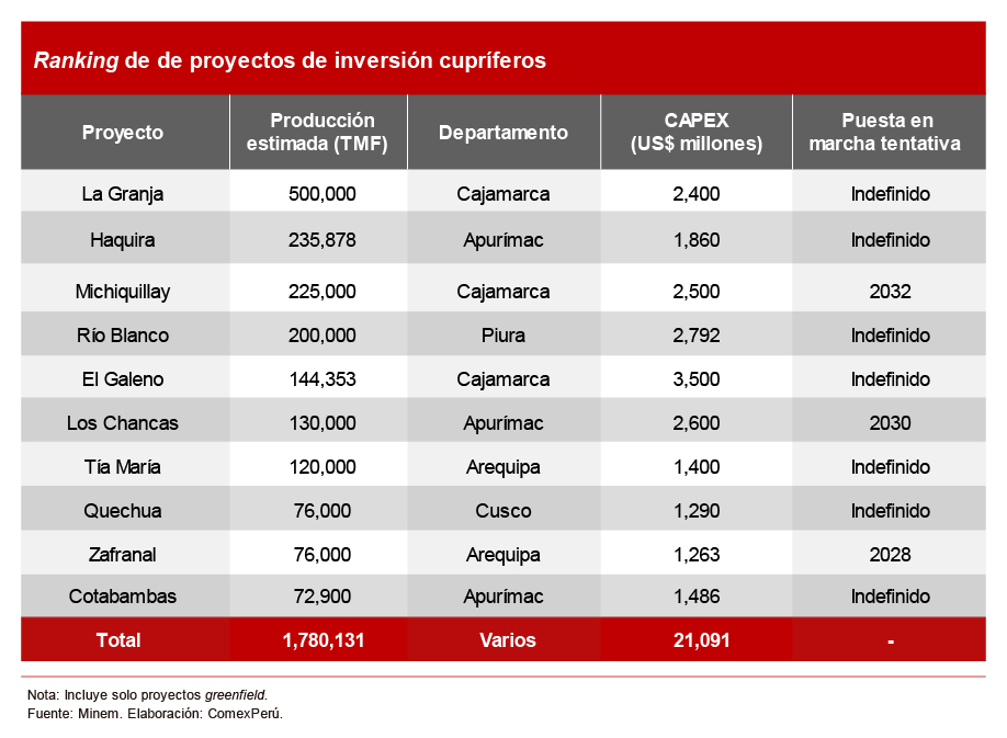 Según el Ministerio de Energía y Minas (Minem), actualmente existen 51 proyectos en la cartera de inversión minera, con una inversión de capital (CAPEX) estimada en US$ 54,556 millones. De estos, 32 son proyectos "greenfield”[1], es decir, no formarían parte de un proyecto preexistente, sino que iniciarían operaciones desde cero.