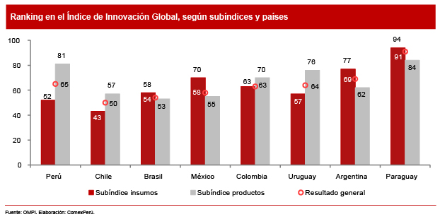 En la última edición, el Perú ocupó el puesto 65 entre las economías evaluadas, lo cual implicó una mejora en cinco posiciones respecto de la edición anterior. Esto posicionó a nuestro país como la sexta mejor economía en innovación en la región América Latina y el Caribe, mientras que los líderes en la región son Chile (puesto 50), Brasil (puesto 54) y México (puesto 58).