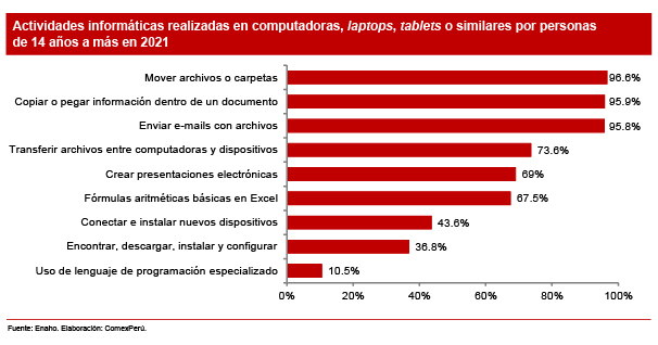 De acuerdo con la Enaho, el año pasado se registró un total de 7,543,145 personas con 14 años a más, a nivel nacional, que utilizaron de manera frecuente computadoras, laptops, tablets o similares, y la gran mayoría de ellos utilizó internet diariamente (95.4% de este grupo). Sin embargo, al analizar las competencias adquiridas en uso de TIC, la gran cantidad de ellos reportó habilidades básicas. Asimismo, más del 95% de la población en edad de trabajar reportó utilizar los medios anteriormente mencionados para mover archivos o carpetas, copiar o pegar información dentro de un documento, o enviar e-mails con archivos adjuntos.