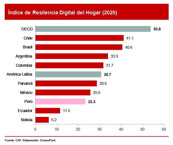 En el caso del Perú, se encuentra por debajo del promedio de América Latina, lo que significa que, de manera agregada, la posibilidad de hogares para acceder a información sanitaria, realizar transacciones monetarias, adquirir bienes por comercio electrónico y contribuir a la educación de niños en países con un índice inferior a 30 es más limitada. Así, resulta evidente por qué una serie de medidas aplicadas por el Gobierno en el marco de la COVID-19 no habrían sido del todo exitosas.