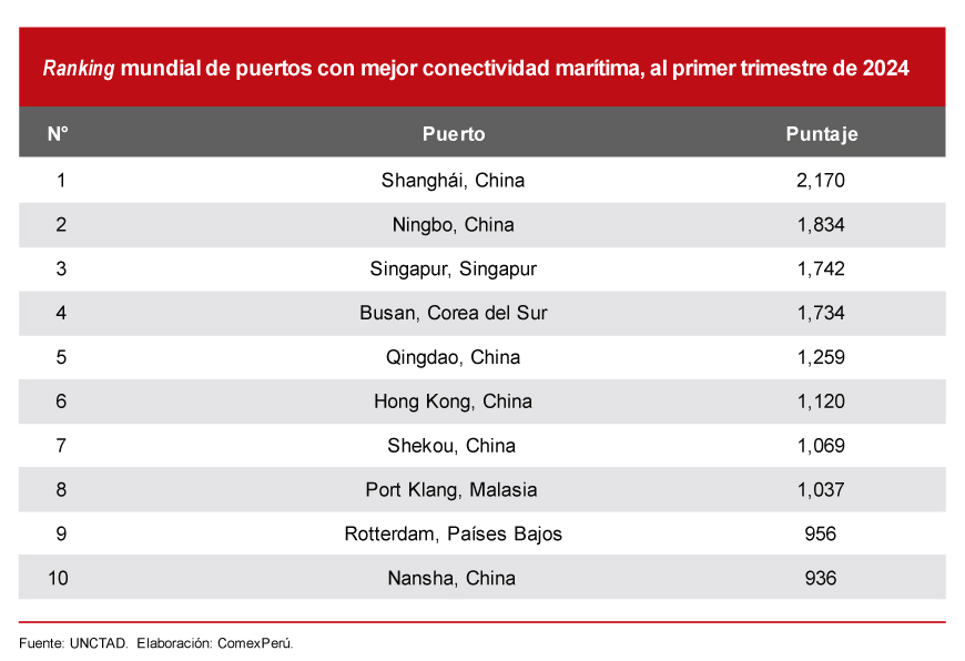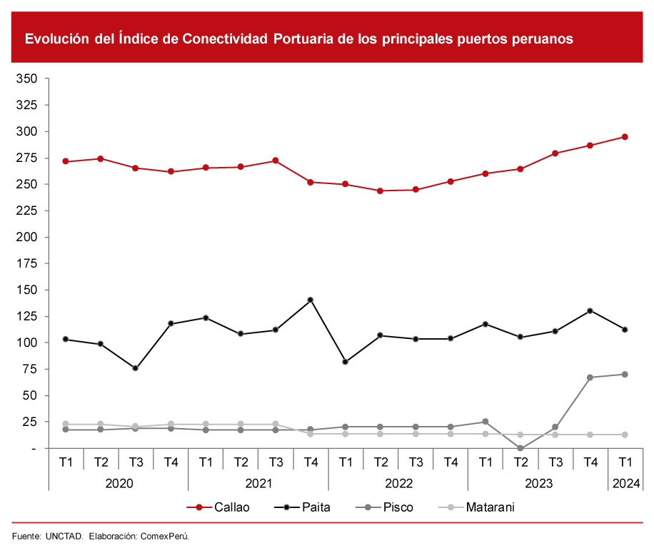 Este progreso se atribuye al desempeño de los puertos peruanos del Callao y Pisco. El primero se posicionó como el mejor a nivel nacional en conectividad de transporte marítimo de contenedores, al ocupar la posición 69 en el ranking (295 puntos). Ello reflejó un ascenso de cinco puestos frente al cierre de 2023 y doce puestos frente a 2022.