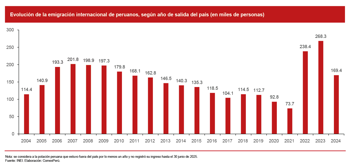 Según el Instituto Nacional de Estadística e Informática (INEI), 169,400 peruanos abandonaron el país en 2024 sin retornar tras al menos un año. Esta dinámica respondería a la búsqueda de entornos menos inseguros, con fácil transición cultural y geográficamente cercanos, con el consecuente impacto directo en la salida de fuerza laboral capacitada.