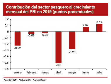 No obstante, en los meses de junio y julio, el INEI muestra que la pesca ha retomado tasas de crecimiento positivas, impulsadas por la captura de especies marinas, tanto para consumo humano directo (+19.7% y +232.6%, respectivamente) como indirecto (+3.9% y +23.9%). Dichos resultados se debieron principalmente a los desembarques de anchoveta, que alcanzaron el 88% (junio) y el 100% (julio) del límite máximo de captura permisible establecido para la primera temporada de pesca de 2019. También cabe mencionar que, entre enero y julio, la pesca continental (aquella referida a la no marítima) ha crecido un 17.9% con respecto al mismo periodo del año pasado; sin embargo, esta actividad solo representa el 4.5% de la producción pesquera.