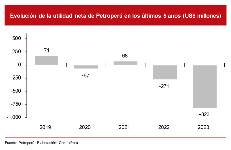 Al revisar los estados financieros de Petroperú correspondientes al año 2023, se observa que los ingresos totales por operaciones regulares ascendieron a US$ 4,009 millones. Por su parte, el costo de venta alcanzó los US$ 4,365 millones, de los cuales US$ 3,757 millones correspondieron a compras de crudo y productos refinados, debido a que la empresa no cuenta con la capacidad suficiente para refinar la extracción de petróleo. Estos resultados generaron que la empresa estatal registre una utilidad bruta negativa de US$ 356 millones.