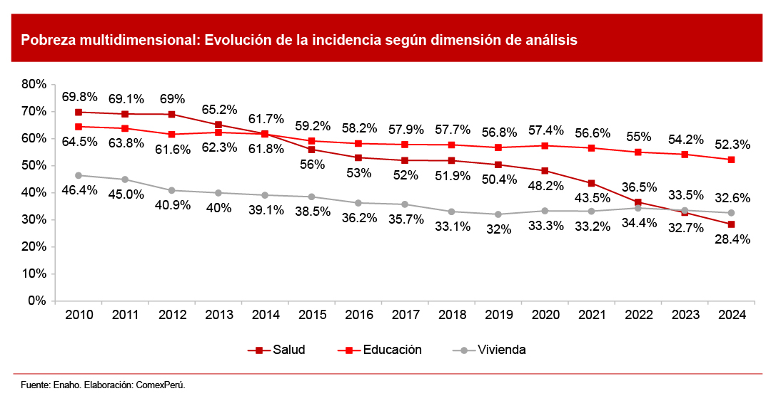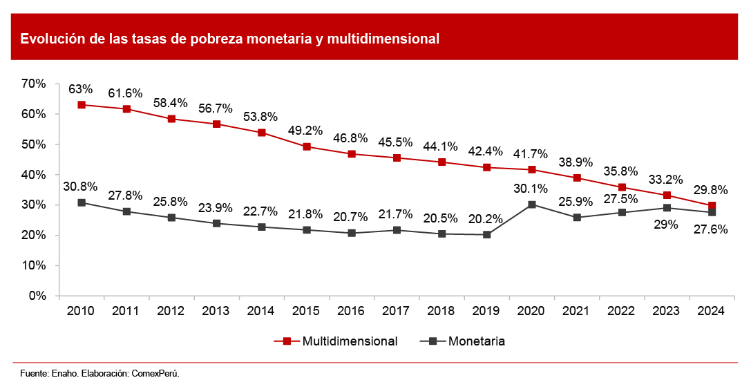 Históricamente, la pobreza multidimensional mantiene una tendencia decreciente, inclusive durante escenarios de desaceleración económica, lo cual no ocurrió con la monetaria. La multidimensional disminuyó del 63% al 29.8% entre 2010 y 2024, mientras que la reducción de la monetaria fue mucho menor tras pasar del 30.8% al 27.6% en el mismo periodo, según estimaciones de la Encuesta Nacional de Hogares (Enaho). Sin embargo, con solo estos resultados no se puede afirmar que haya mejoras tangibles en la calidad de vida de las personas.