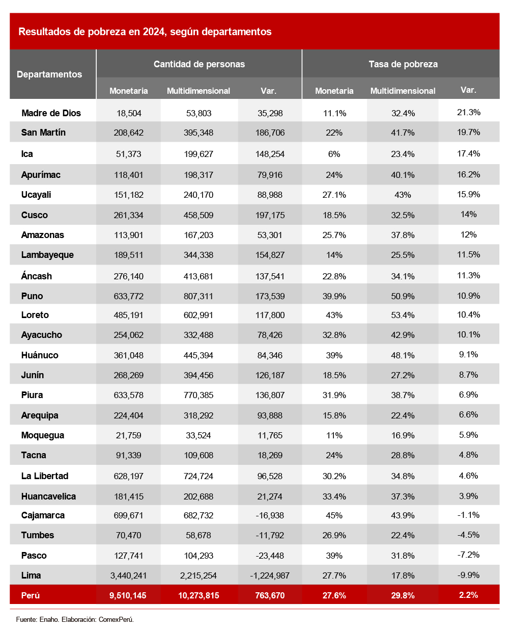 La pobreza multidimensional continúa superando a la monetaria en 20 de 24 departamentos. La mayor brecha ocurre en Madre de Dios, donde la monetaria afectó al 11.1% de la población, pero la multidimensional, al 32.4%, durante el año pasado. En este departamento, la monetaria perjudicó a 18,504 personas, mientras que la multidimensional, a 55,803.