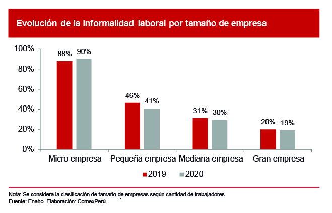 Nuestro mercado laboral se caracteriza por altas tasas de informalidad en el tejido empresarial y precariedad laboral, con una alta rotación de trabajadores, inadecuadas condiciones laborales y bajo acceso a seguridad social. Las enormes dimensiones de la informalidad involucran alrededor del 75.3% de la fuerza laboral en 2020, según cifras de la Encuesta Nacional de Hogares (Enaho), lo cual significa que tres de cada cuatro empleos son informales.