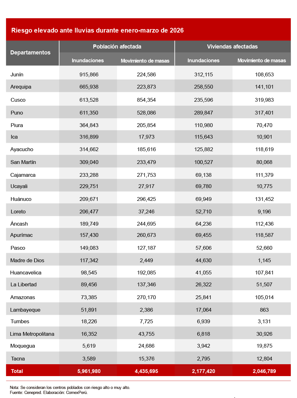 Recientemente, el Gobierno declaró el estado de emergencia en algunos departamentos por riesgo elevado de inundaciones. Este fenómeno recurrente expondría a casi 6 millones de peruanos a nivel nacional durante el primer trimestre del año, mientras que casi 4.5 millones podrían ser afectados por movimientos de masas (huaicos y avalanchas). Junín, Arequipa, Cusco y Puno destacan por su vulnerabilidad.