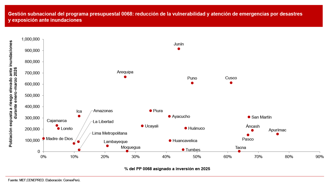 La mayoría de los departamentos replica esta dinámica: 18 de 24 asignan menos de la mitad del presupuesto subnacional del programa 0068 a inversión pública. Existe una ligera tendencia positiva con respecto al nivel de vulnerabilidad: entre mayor cantidad de población expuesta a inundaciones se prioriza la inversión pública. Sin embargo, en los departamentos más vulnerables (Junín, Arequipa, Puno y Cusco) se interrumpe la relación. Estas cuatro necesitan invertir más en defensas ribereñas, sistemas de drenaje pluvial, muros de contención, etc.
